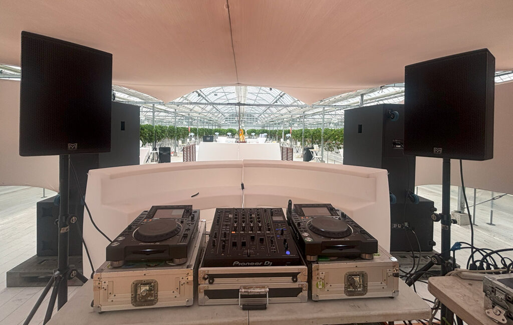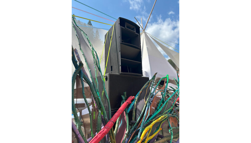 設営時はスピーカー用の足場にウーハーを設置し、その上にTHVを配置しています。3〜4名いればスムーズに設営でき、運用も安定しています。