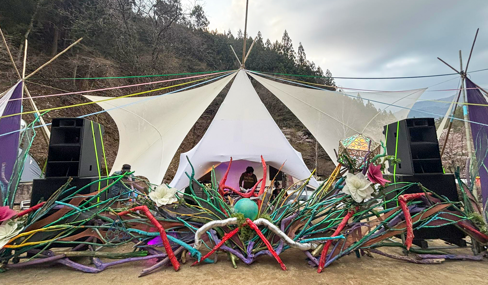 設営時はスピーカー用の足場にウーハーを設置し、その上にTHVを配置しています。3〜4名いればスムーズに設営でき、運用も安定しています。